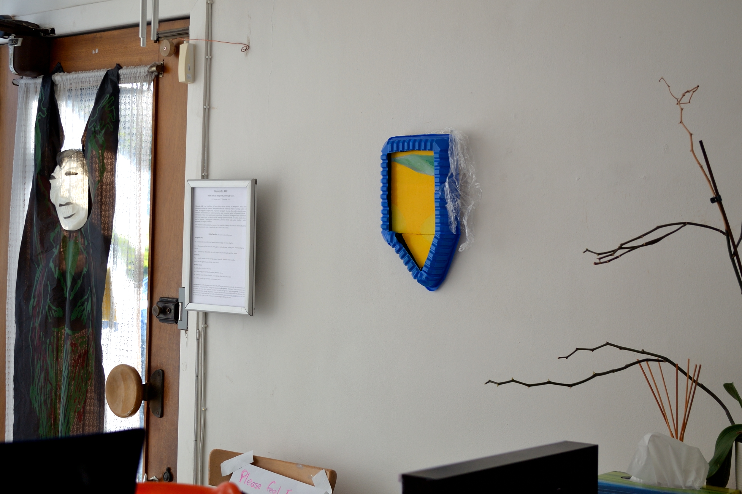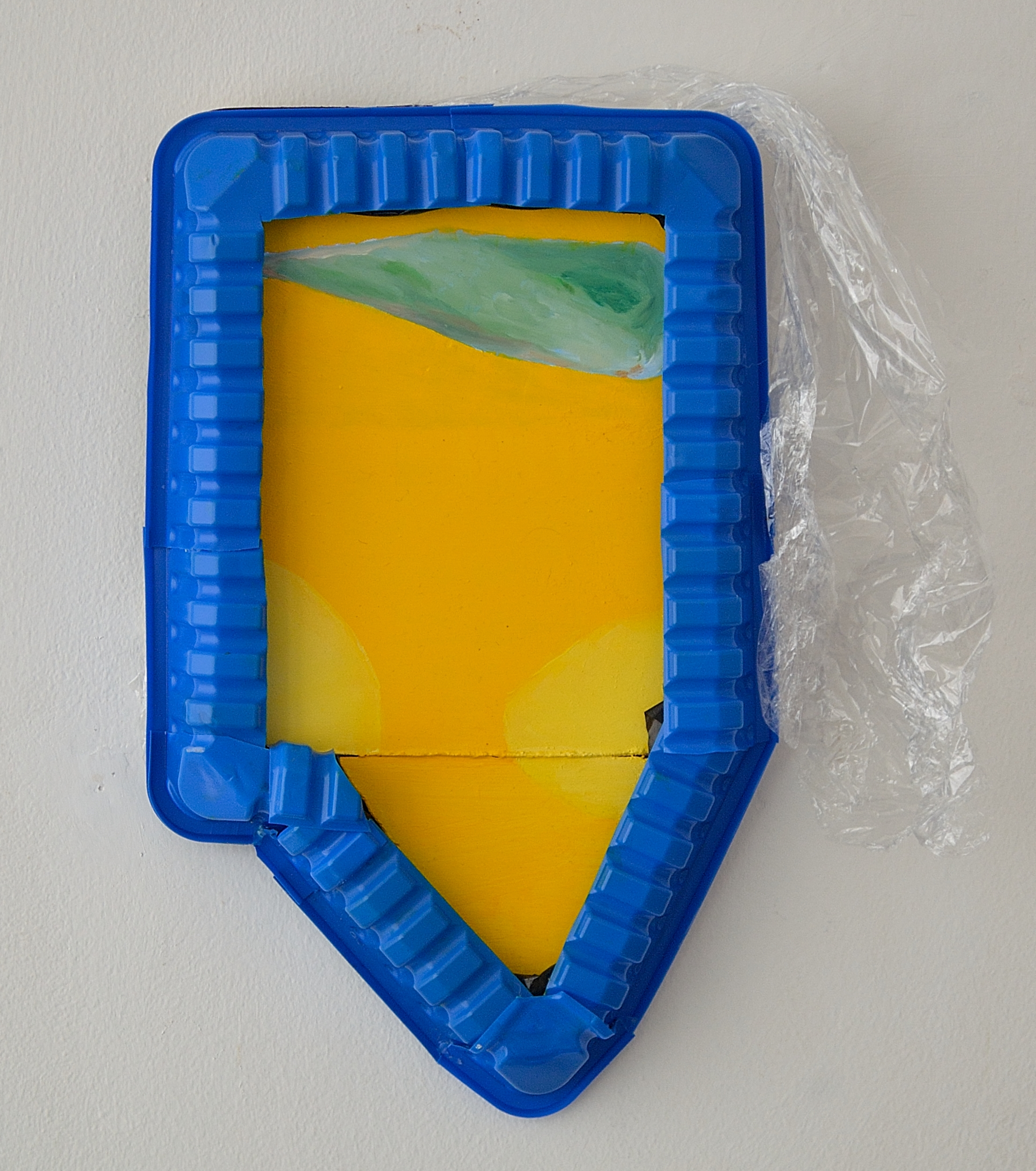 Ostensible icon, 2018, Danny Kelly, oil, MDF, bin liner, food packaging, 35×30 cm