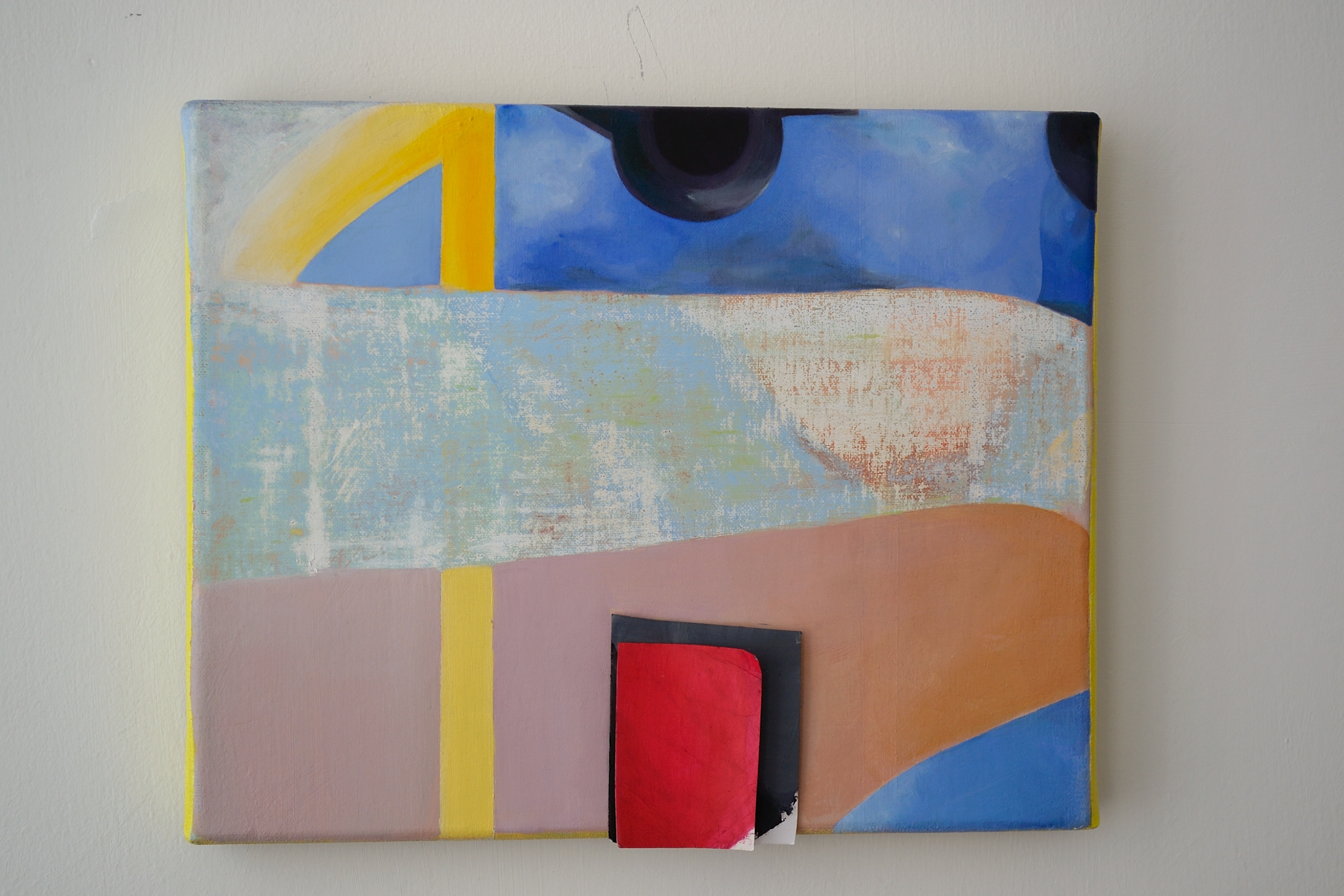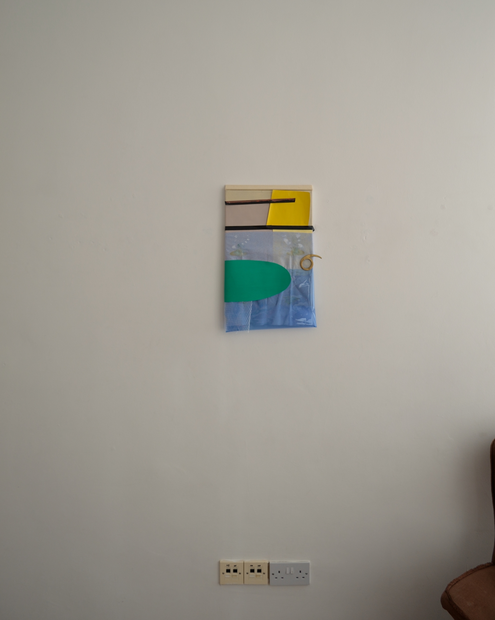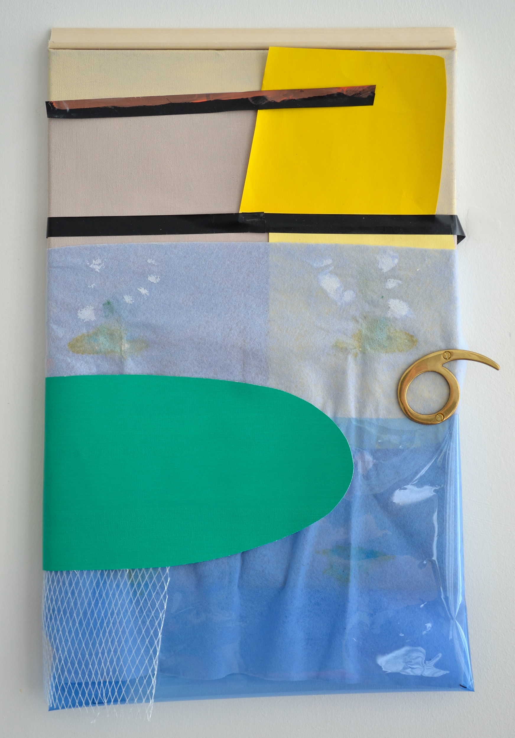 Leave or stay (Rik), 2018, oil, paper, J-cloth, canvas, filter paper, moulding, plumbing tape, wine packaging, door number, 50×35 cm