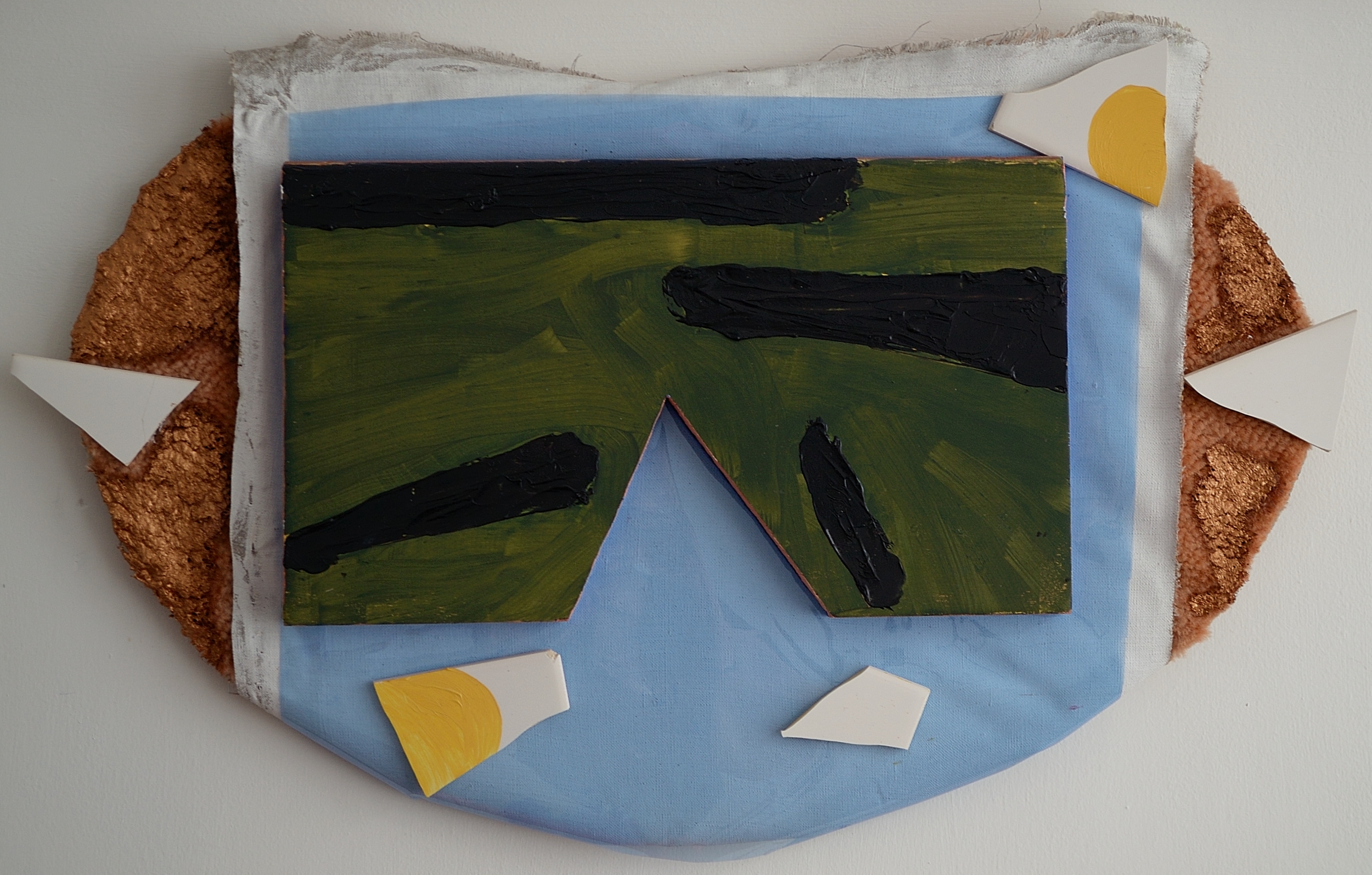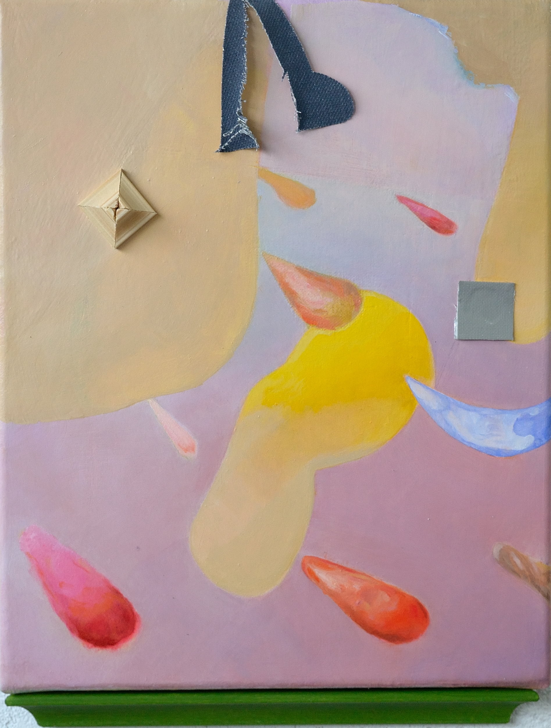 House music, 2018, Danny Kelly, oil, acrylic, wood, filter paper, canvas, tiles, carpet, 45×55 cm