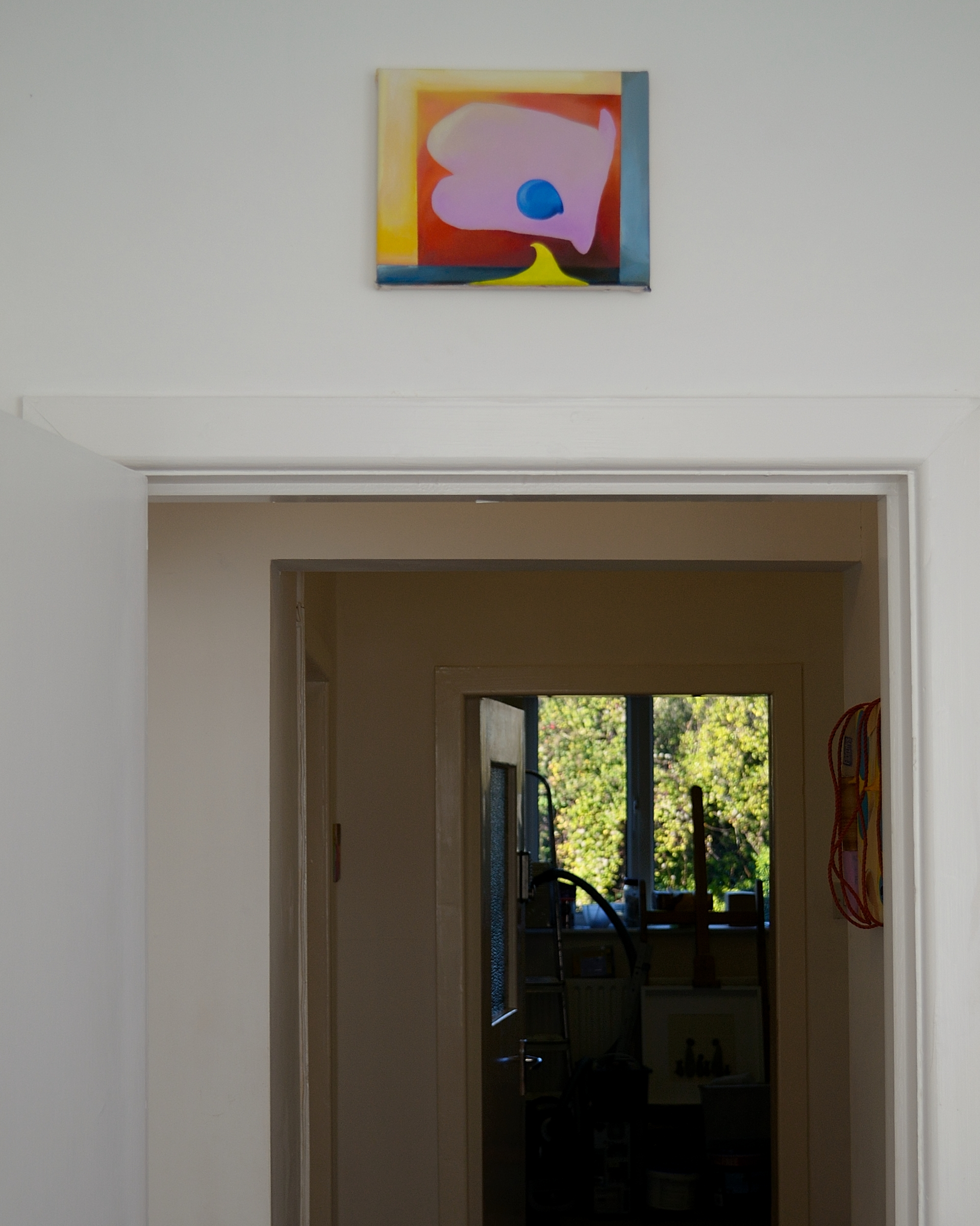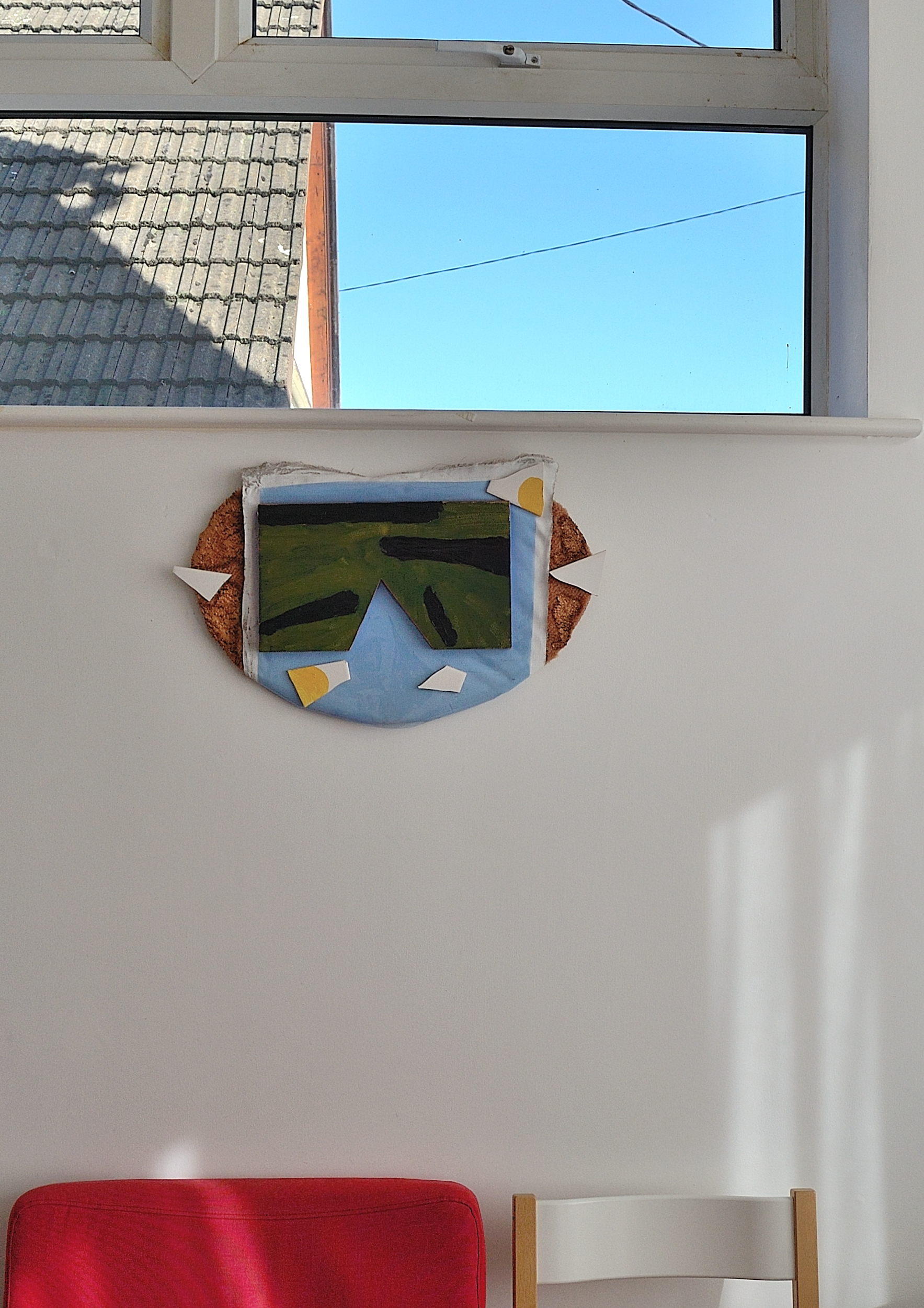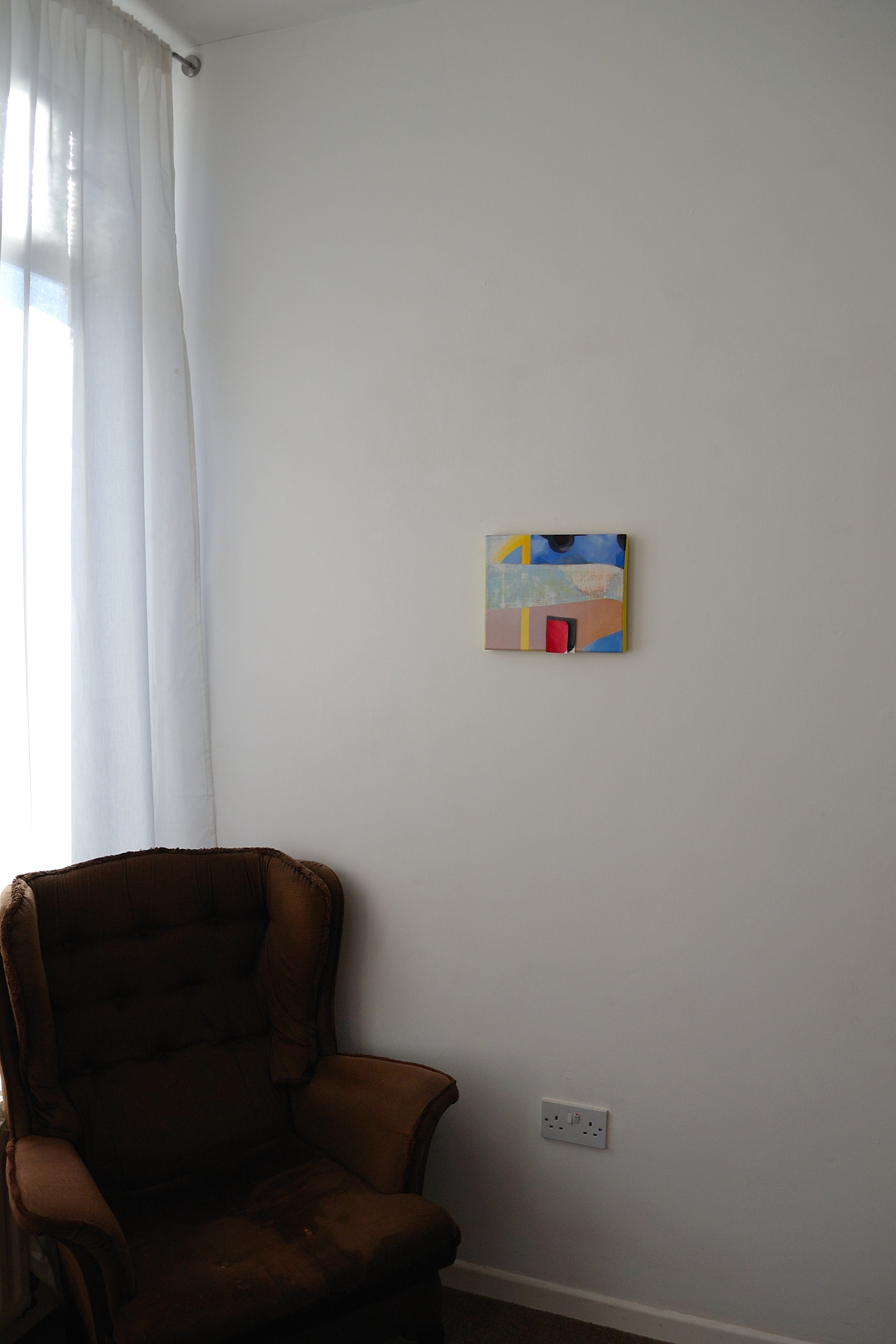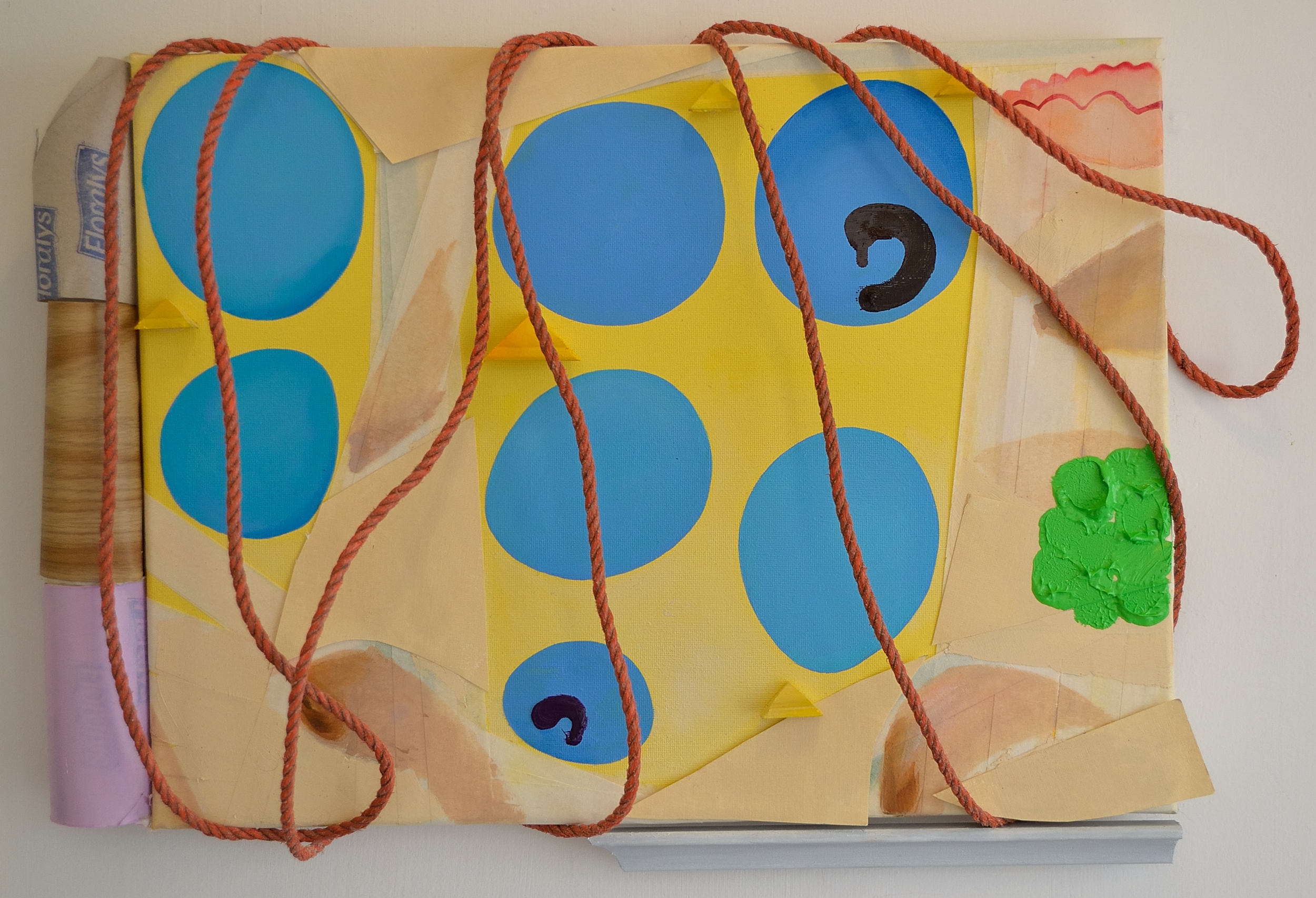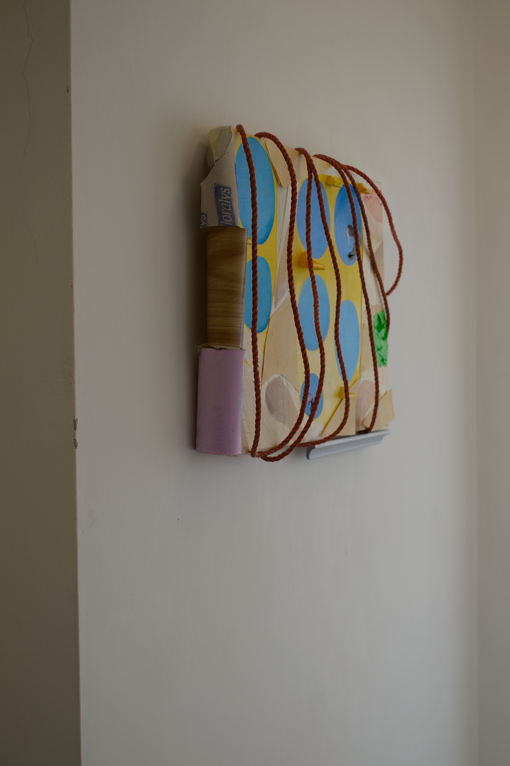 Lonely indoors, 2018, Danny Kelly, oil, acrylic, moulding, paper, toilet rolls, rope on canvas, 50×34 cm